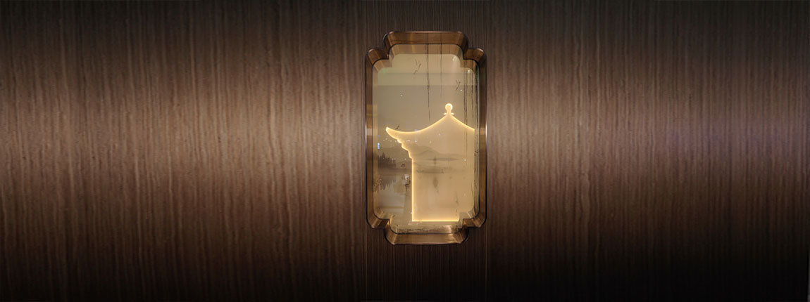 一進(jìn)入口,映入眼簾的就是特色走廊。走廊的棕鋼材質(zhì)玻璃內(nèi)設(shè)絹布繡圖,繪制了西湖景區(qū)的三個(gè)景點(diǎn):集賢亭、斷橋殘雪、三潭印月,讓您一入休息室,就可放松身心,置身于西湖美景之中。