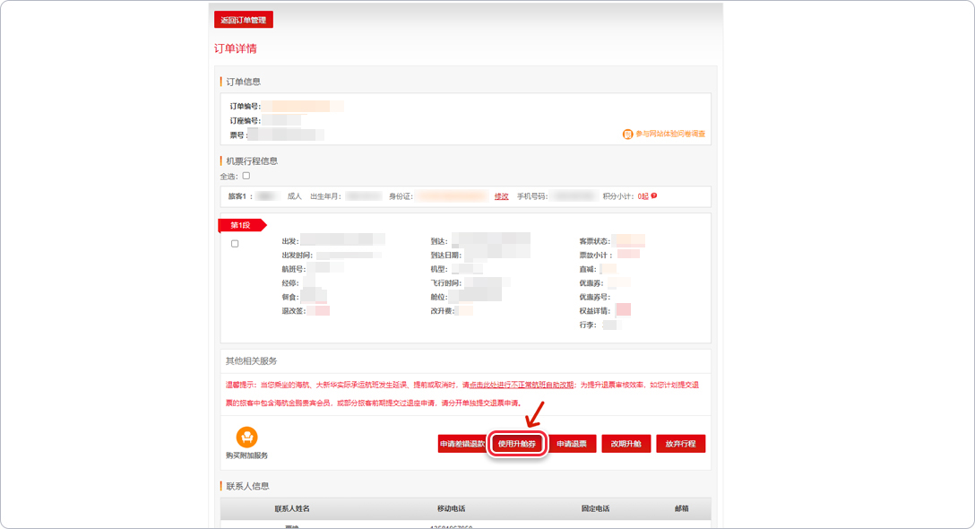 3、非自愿變更:僅允許降至原經(jīng)濟艙艙位,變更后客票不可再次使用升艙券。在客票變更完成后,將原已使用的升艙券人工保障做退券處理后,同時用戶需點擊“訂單詳情”頁面的“補發(fā)升艙券”按鈕后,系統(tǒng)將生成新升艙券,升艙券會退回實際使用人賬戶,可再次使用。其他保障規(guī)定按現(xiàn)行海航國際及地區(qū)航線不正常事件票務處理規(guī)定辦理。