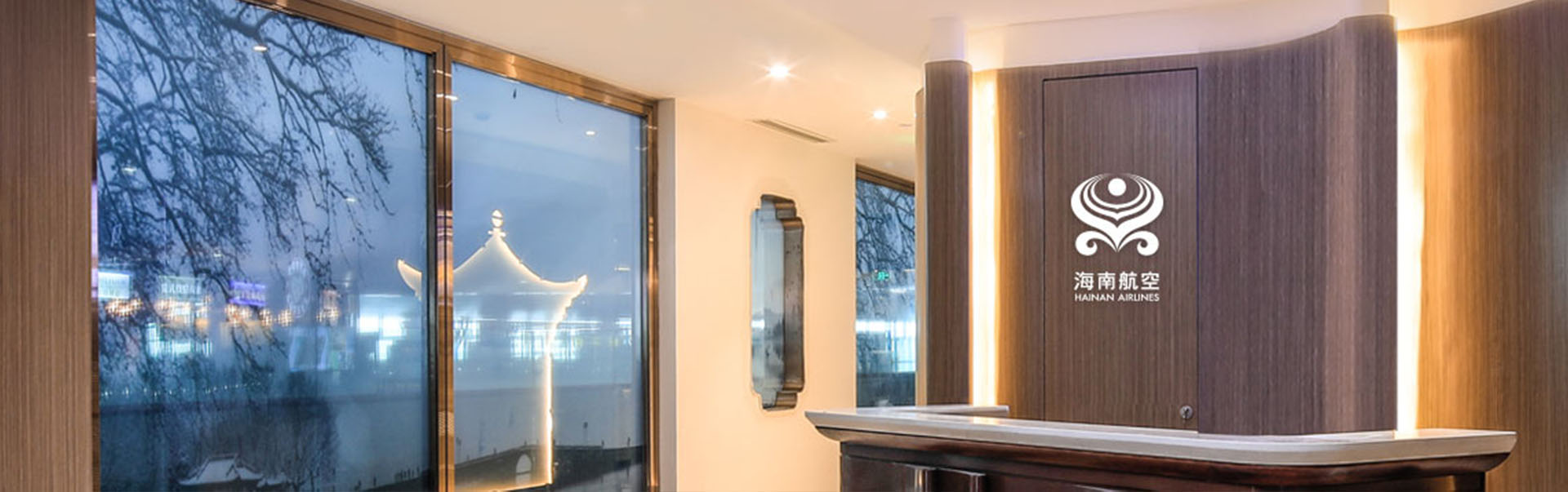 一進(jìn)入口,映入眼簾的就是特色走廊。走廊的棕鋼材質(zhì)玻璃內(nèi)設(shè)絹布繡圖,繪制了西湖景區(qū)的三個(gè)景點(diǎn):集賢亭、斷橋殘雪、三潭印月,讓您一入休息室,就可放松身心,置身于西湖美景之中。