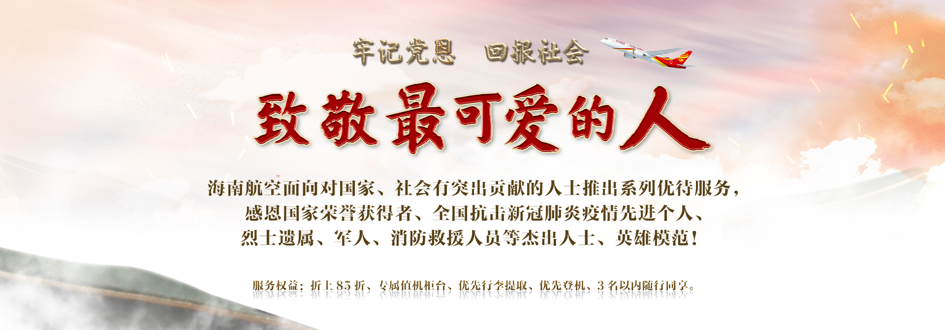 本著牢記黨恩、回報社會的初心,海南航空面向?qū)?、社會有特殊貢獻的人士推出系列優(yōu)待服務(wù),感恩國家榮譽獲得者、全國抗擊新冠肺炎疫情先進個人、烈士遺屬、軍人、消防救援人員等杰出人士、英雄模范!