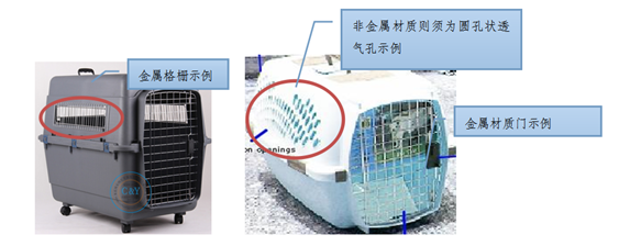 2.寵物箱的通風(fēng)口應(yīng)為金屬材質(zhì)并牢固安裝在寵物箱上,如通風(fēng)口非金屬材質(zhì)則須為圓型或其它形狀透氣孔。