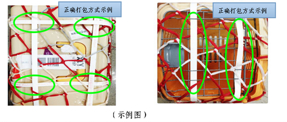 2.使用打包帶打包時(shí),打包帶需在防護(hù)網(wǎng)外層進(jìn)行打包。中號箱(寵物箱體積規(guī)格大于等于81×55×58cm,小于91×60×66cm的為中號寵物箱)頂部及底面每面至少橫、豎各捆扎2匝,呈“井”字形,大號箱(寵物箱體積規(guī)格大于等于91×60×66cm)頂部及底面每面至少橫、豎各捆扎3匝,打包帶分布均勻,為避免打包時(shí)翻轉(zhuǎn)寵物箱驚擾小動(dòng)物,寵物箱側(cè)面不進(jìn)行橫向打包,側(cè)面的打包帶均須呈豎狀平行狀態(tài)。要求打包時(shí)將打包帶穿過箱門網(wǎng)格及防護(hù)網(wǎng)格,從一個(gè)格中伸進(jìn)去,從下一個(gè)網(wǎng)格伸出來,間隔均勻,起到將箱門和箱體、防護(hù)網(wǎng)兜固定在一起的作用。正確打包實(shí)例如下圖: