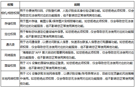 您在使用海南航空APP時(shí),我們需要獲取一些權(quán)限以便向您提供更優(yōu)質(zhì)的服務(wù)。在獲取對應(yīng)的權(quán)限前,我們會(huì)征詢您的同意。您也可以通過設(shè)備操作系統(tǒng)的設(shè)置,關(guān)閉對應(yīng)的授權(quán)。